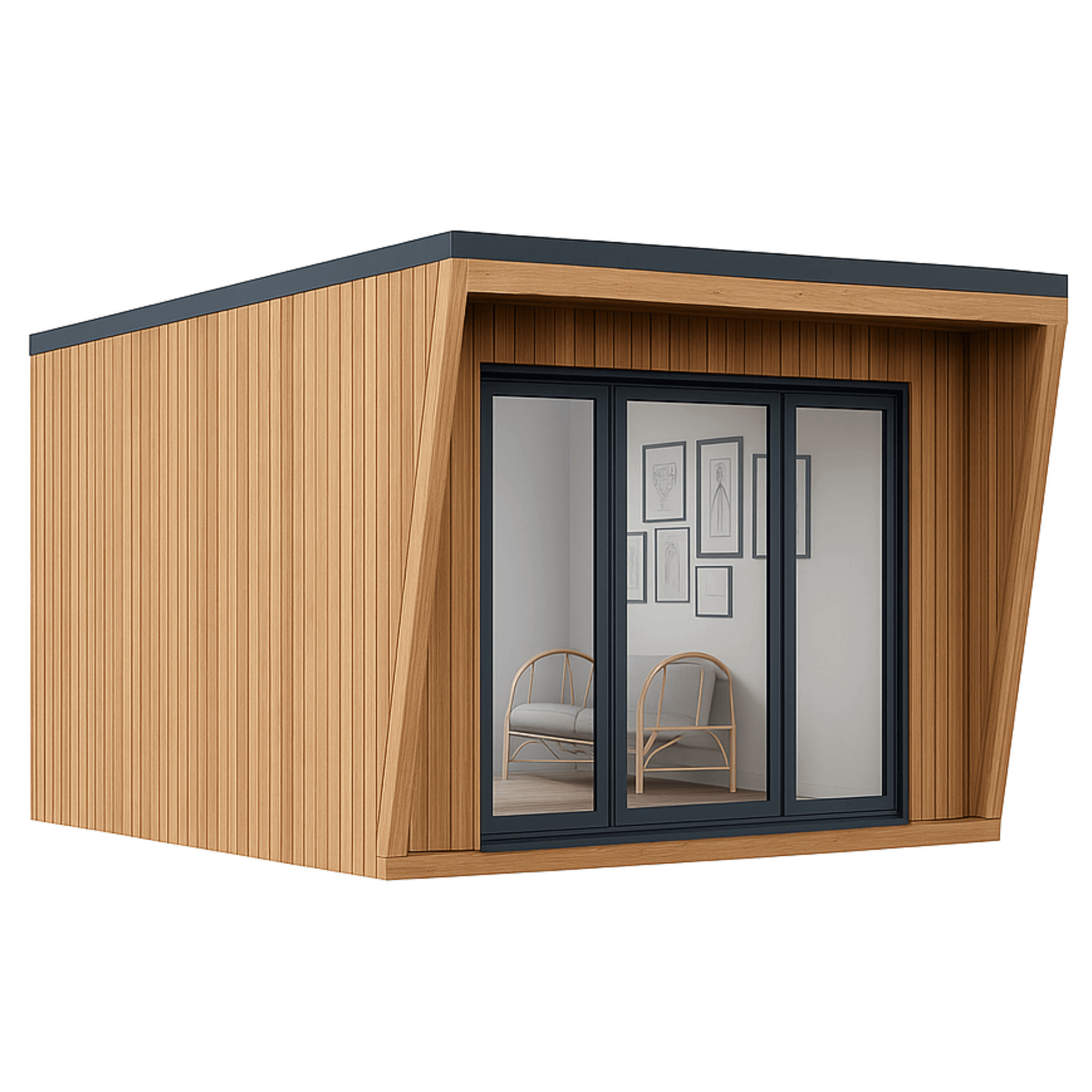 Bring distinctive architecture to your garden with the Aspect Room – featuring a unique diagonal overhang and clean, modern lines. Enjoy abundant natural light from a sleek single door with glazed side panels, perfect for a home office, studio, gym, or creative retreat.